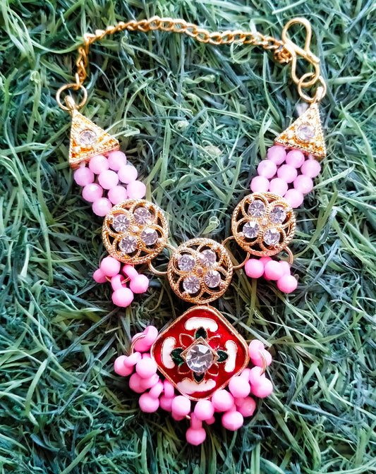 Peach Beads Meena Flower Necklace