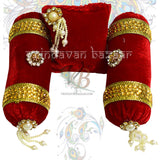 Red velvet decorated cushion with a pair of round pillows