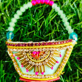 Elevate the beauty of your Radha Rani or Mata Rani with this elegant sea green zardozi purse, adorned with delicate bead embroidery and fine zari work. The soothing sea green hue symbolizes peace and devotion, making it perfect for both daily pooja and festive occasions. Designed to enhance your deity’s shringar, this lightweight and finely crafted purse blends traditional craftsmanship with spiritual elegance. The shimmer of zari and sparkle of beads add a divine glow to your idol's attire. A timeless accessory that reflects grace, devotion, and artistic detail.